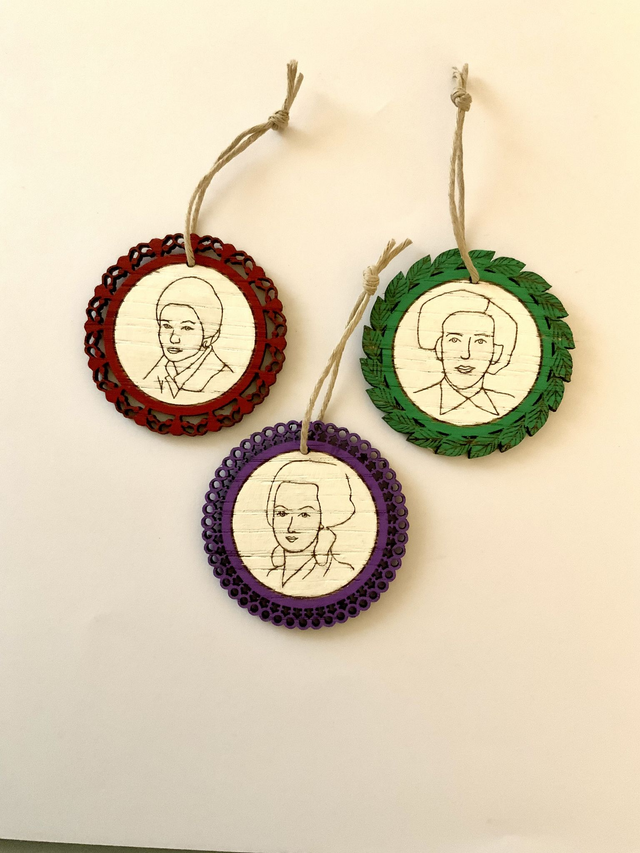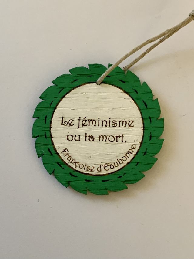 Boules de Noël avec au recto Françoise d’Eaubonne et au verso l’inscription « Le féminisme ou la mort. », entourée de feuilles.