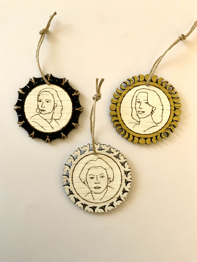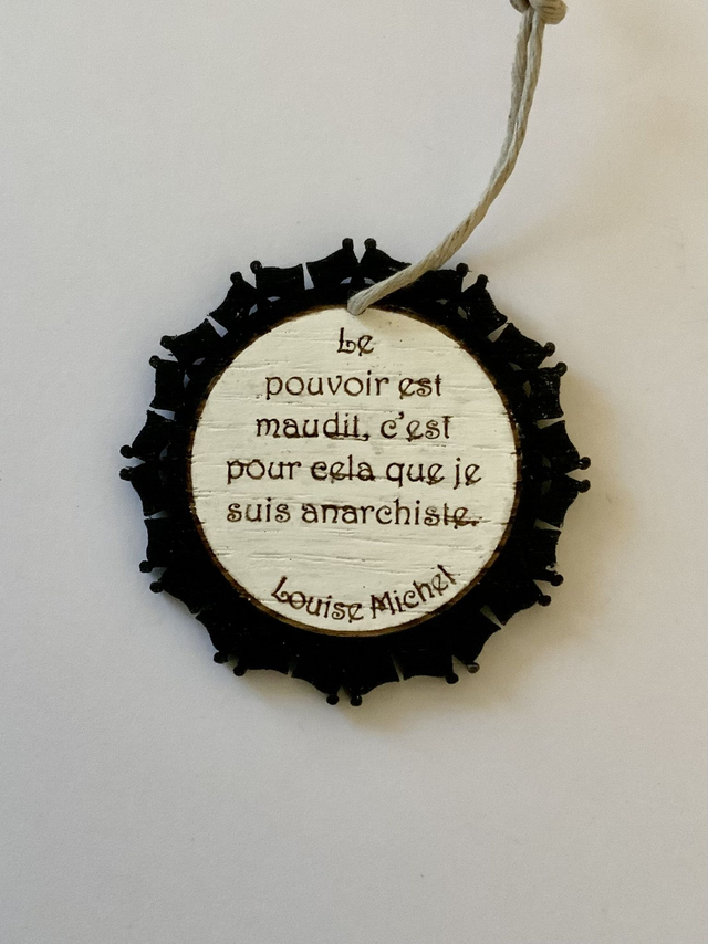 Boules de Noël avec au recto Louise Michel et au verso l’inscription « Le pouvoir est maudit, c’est pour cela que je suis anarchiste. », entourée de drapeaux noirs.