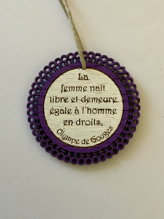 Boules de Noël avec au recto Olympe de Gouges et au verso l’inscription « Le femme naît libre et demeure égale à l’homme en droits », entourée de symbole femme.