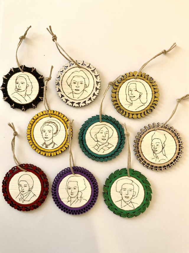 Boules de Noël avec au recto Simone Veil et au verso l’inscription « 1975 loi Veil », entourée d’utérus.
