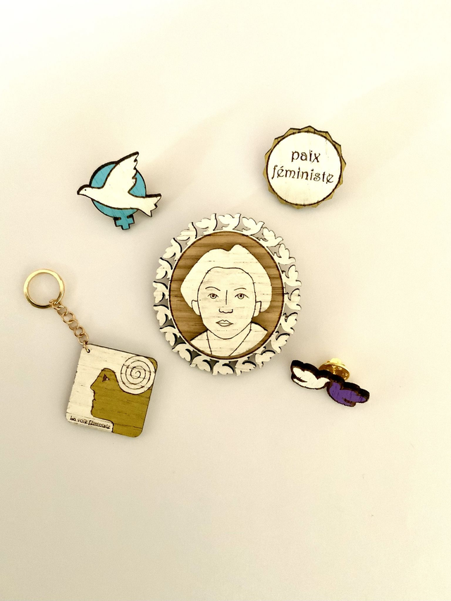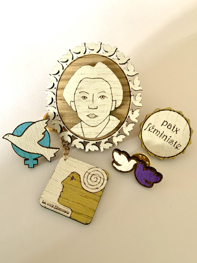 Broche camée en bois d’Hélène Brion entourée de colombes car elle était pacifiste et s’est battue pour la paix au travers du féminisme.