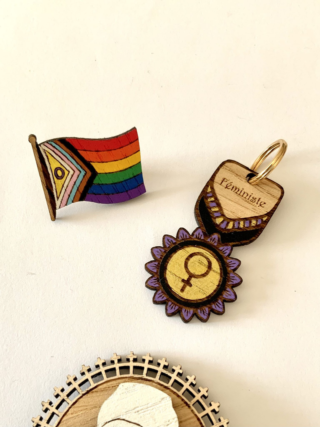 Pin’s « drapeau progressif » car toutes les minorités de genre et orientations sexuelles doivent être défendues par le féminisme.