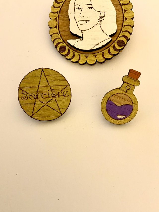 Pin’s « sorcière » car Mona a écrit sur les sorcières et leur représentation féministe, symbole à la fois de l’injustice de la misogynie et de la puissance des femmes.