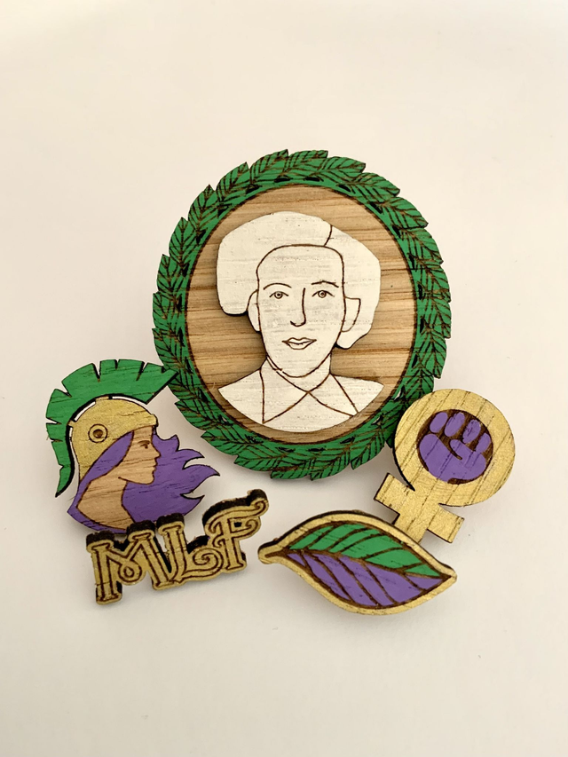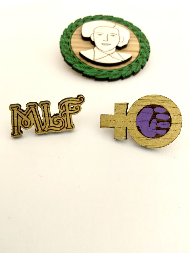 Pin’s « symbole MLF » car Françoise d’Eaubonne est une des fondatrices du Mouvement de Libération des Femmes.