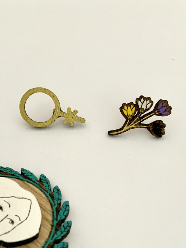 Pin’s « symbole non-binaire » car les genres sont des constructions sociales et qu’on peut les déconstruire et se représenter comme on veut.