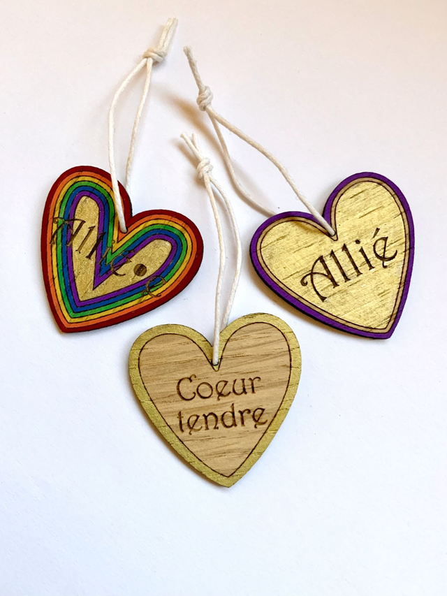 Suspension en bois d’un cœur avec le centre doré entouré des couleurs du drapeau LGBT et l’inscription « allié•e ».